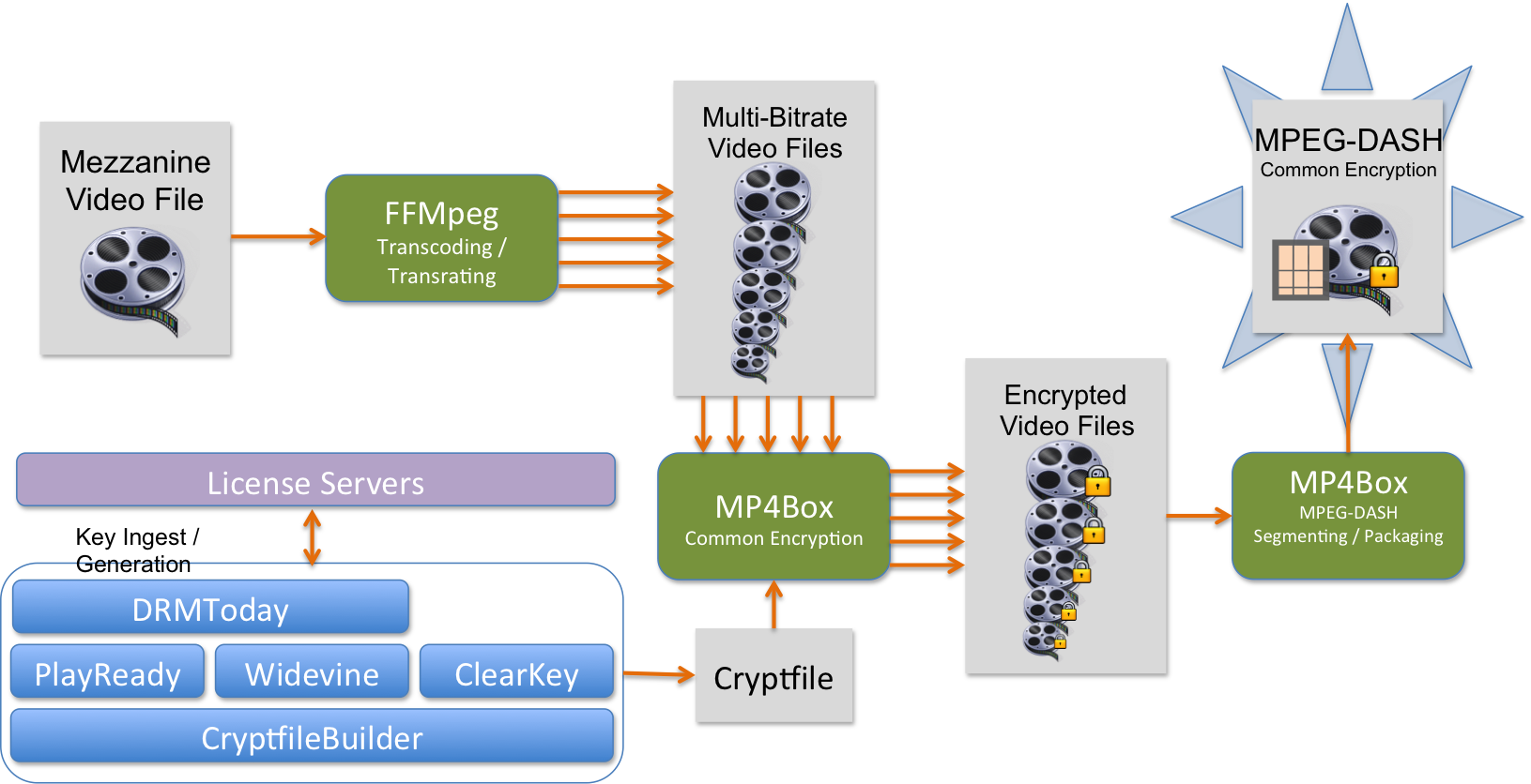CableLabs has developed a process for creating encrypted MPEG-DASH adaptive bitrate media involving some custom software combined with existing open source tools. The following sections will introduce the software and go through the process of creating protected streams. These tools and some accompanying documentation are available on GitHub. A copy of the documentation is also hosted here.