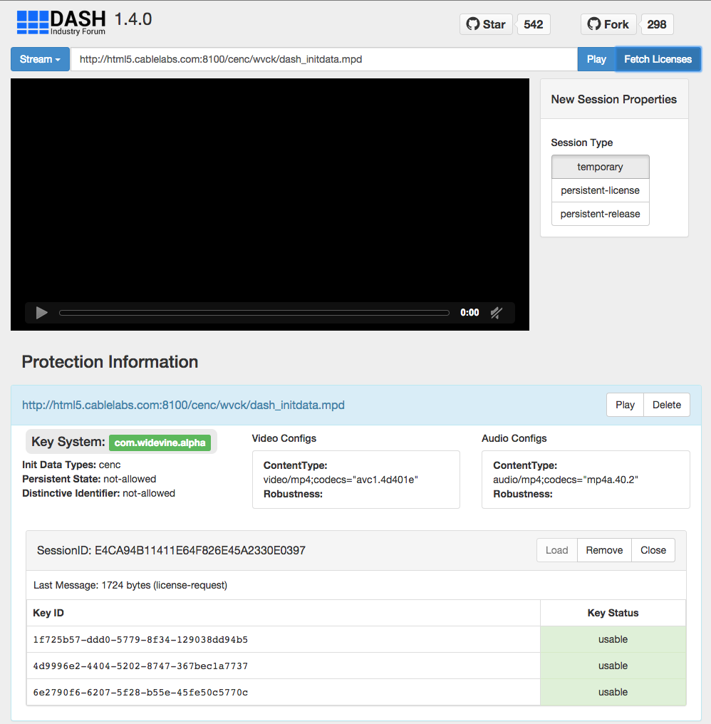 An EME demo app is provided with dash.js (samples/dash-if-reference-player/eme.html) that provides some visibility and control into the EME operations taking place in the browser. The app allows the user to pre-fetch licenses, manage key session persistence, and playback associated content. It also shows the selected key system, and the status of all licenses associated with key sessions.