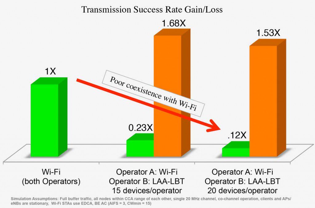 Also keep in mind this is for the most coexistence friendly case of where q = 32 for the LAA using EU LBE clients. If you decrease the q value, both the LAA using EU LBE clients and the Wi-Fi performance suffers.