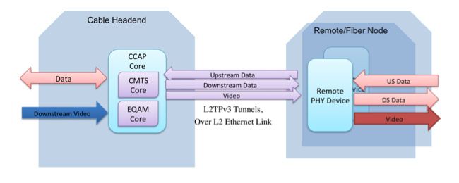 The Remote PHY technology uses pseudowires between a CCAP Core and a set of RPDs. The CCAP Core contains both a CMTS Core for supporting DOCSIS data transport and an Edge QAM Core for supporting video transport. The CMTS Core contains the DOCSIS MAC (signaling functions, downstream and upstream bandwidth scheduling, and DOCSIS framing) and the upper layer protocols. Remote PHY supports both DOCSIS 3.0 & 3.1 Specifications. The EQAM Core contains all the video processing functions that an EQAM provides today.